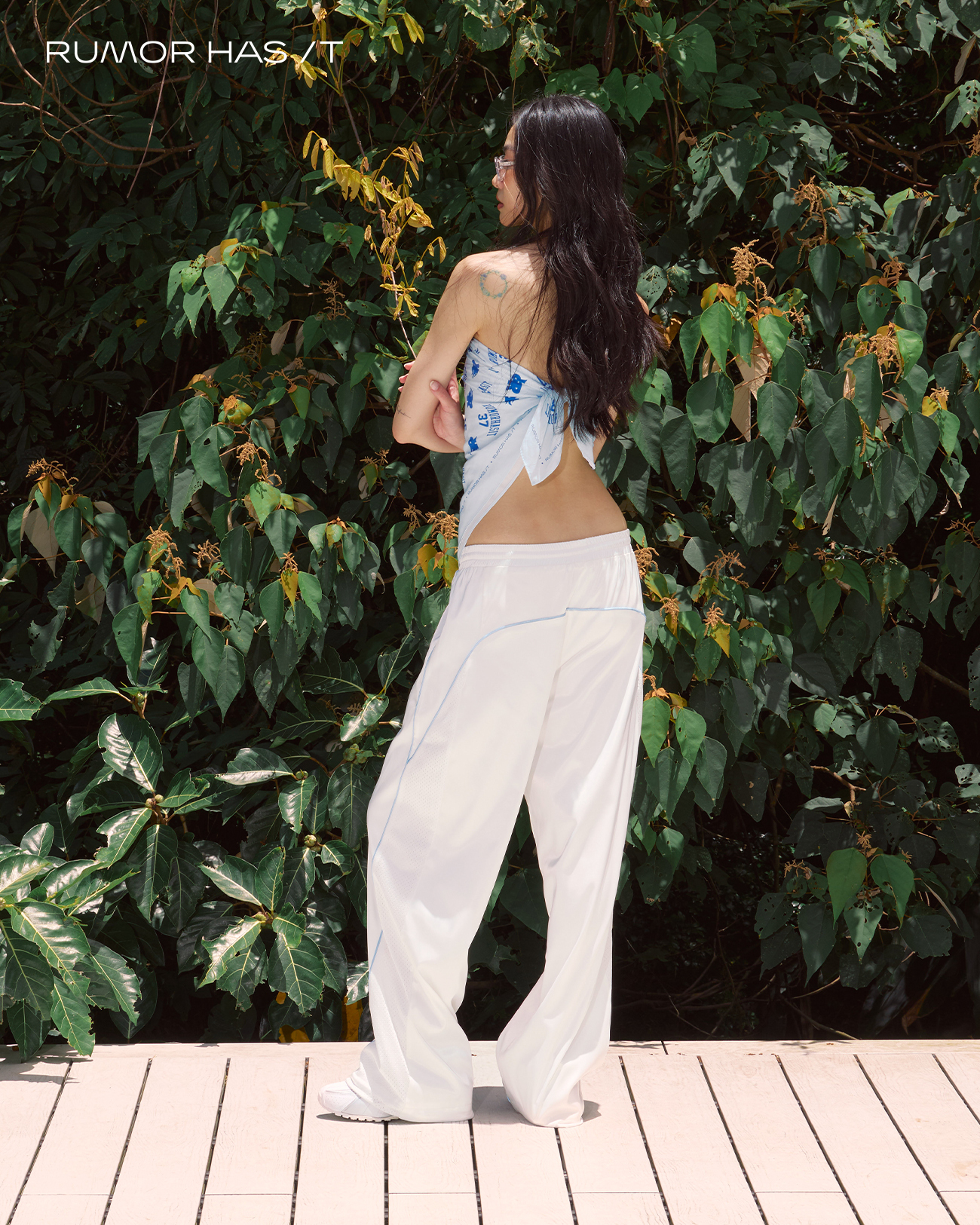 褲管拼接透氣網布的細節,為緞面布帶來不一樣的氛圍。