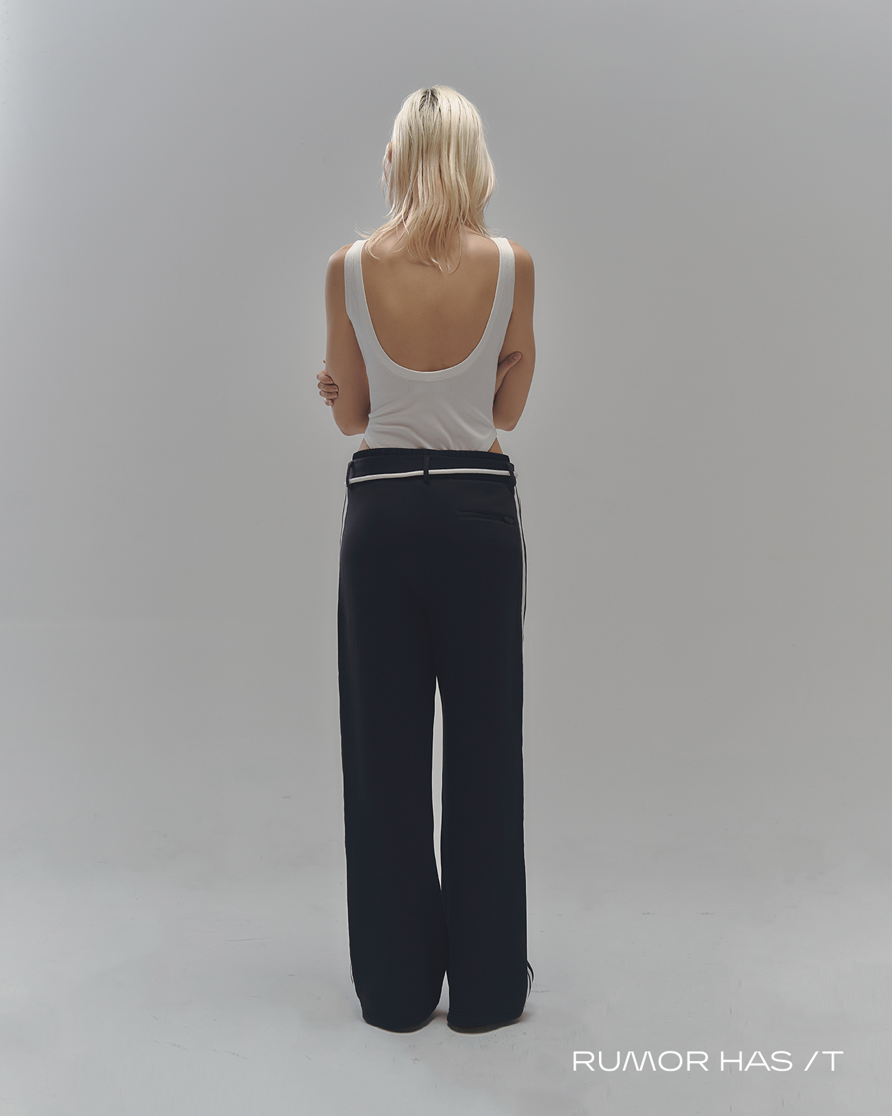 使用輕盈透氣帶有挺度的布料打造出修身直筒的寬褲