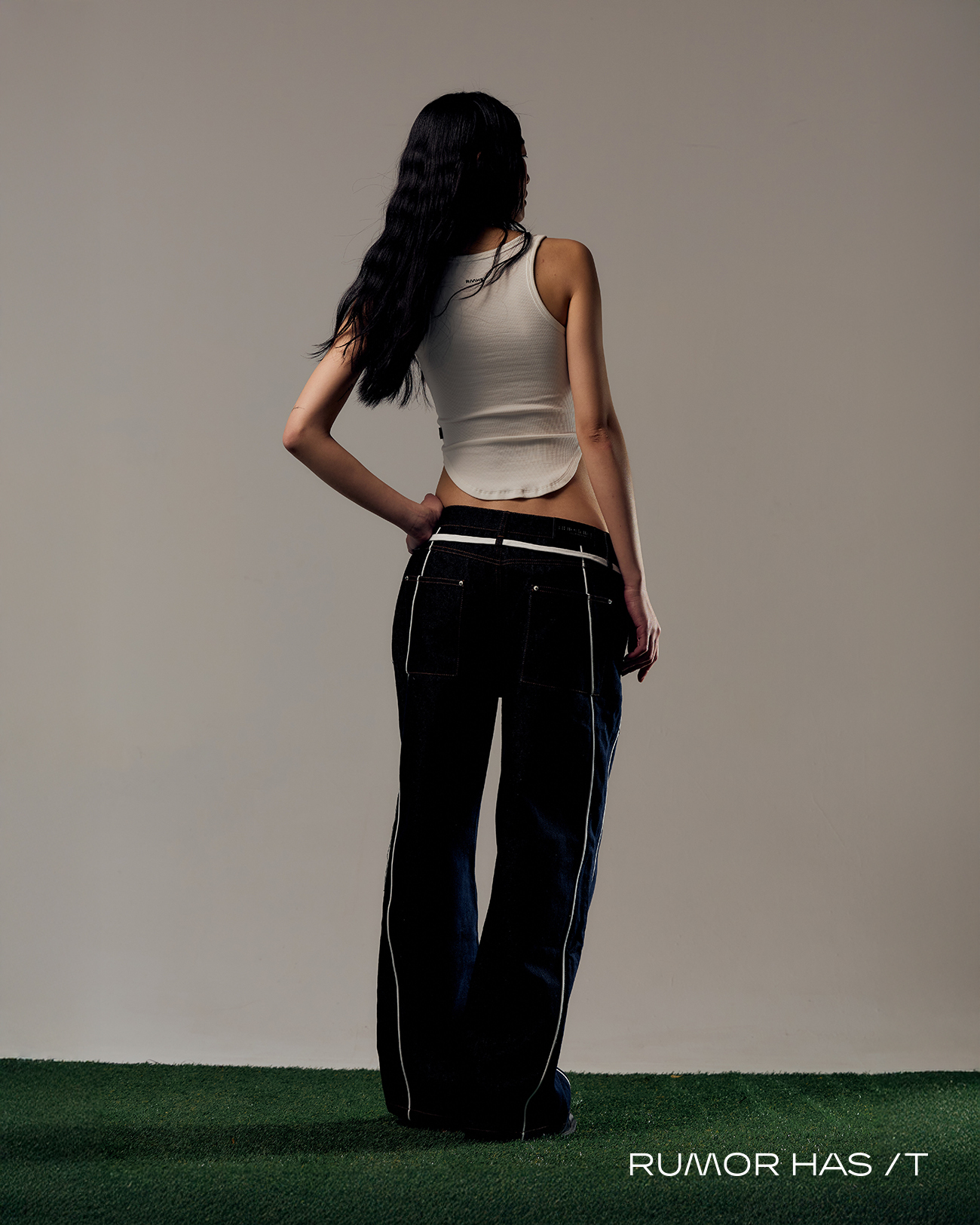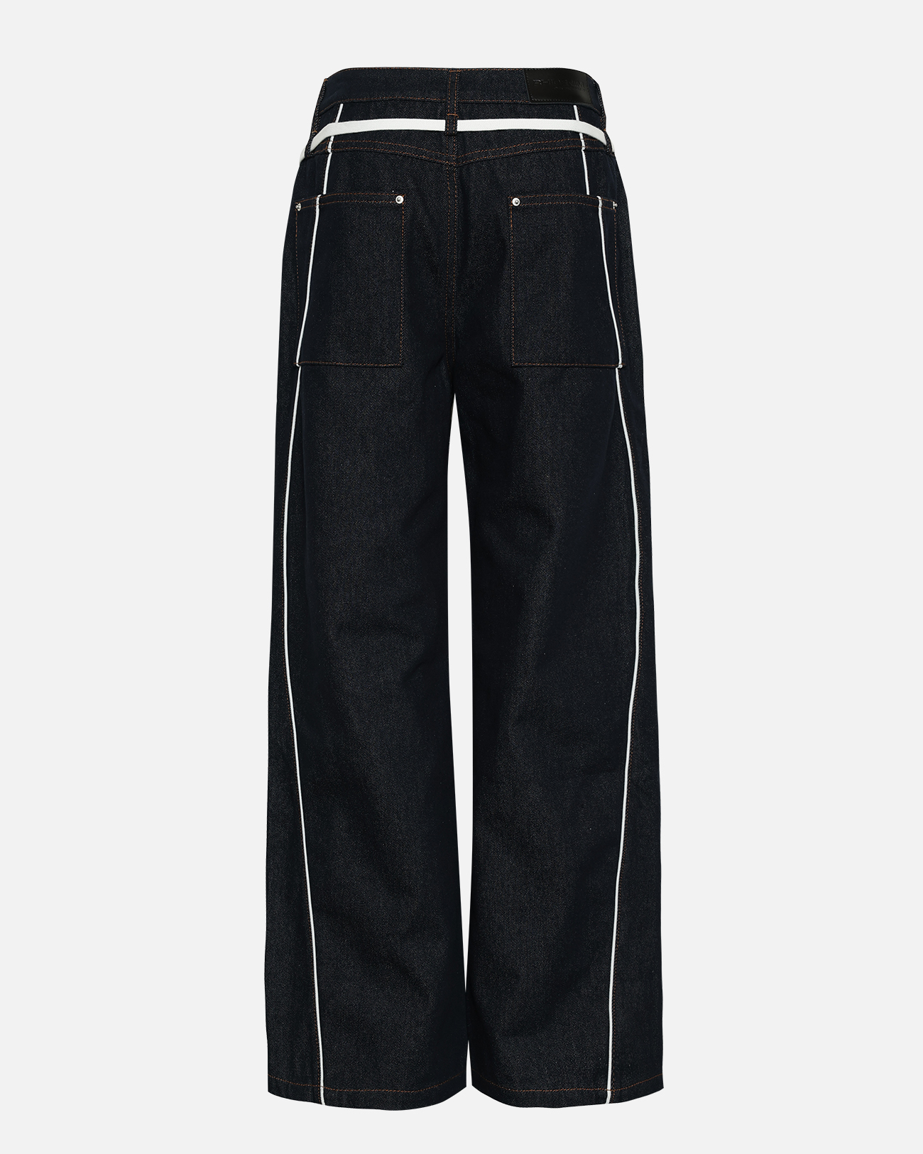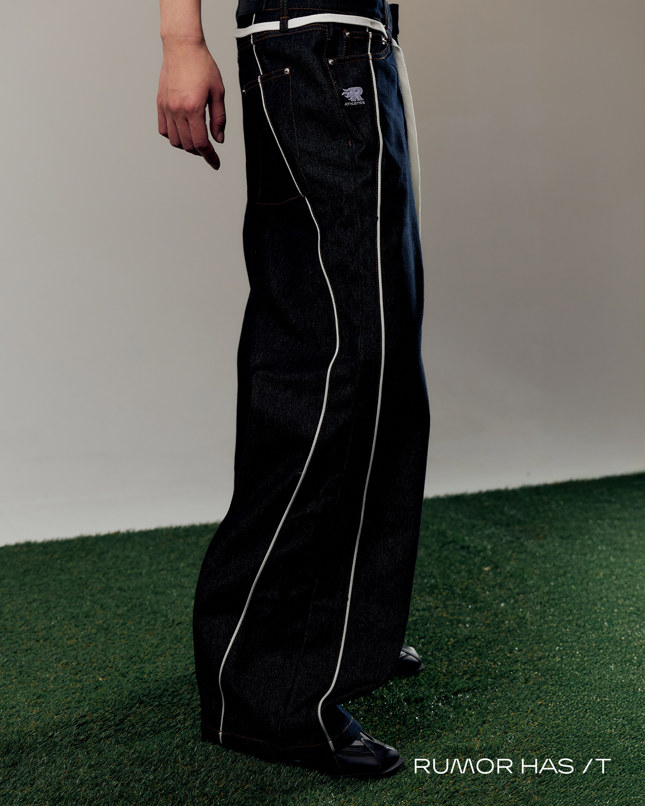 寬鬆直筒但很修身的剪裁,原色牛仔布搭配運動風的線條裝飾
