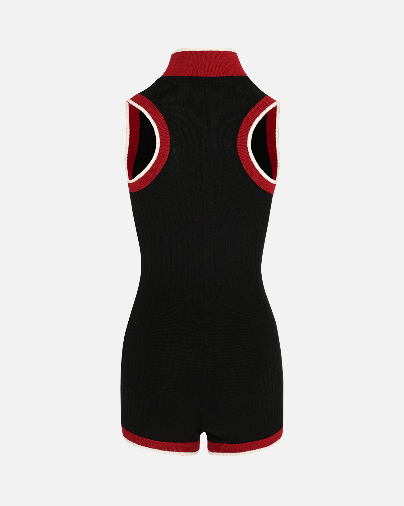 修身剪裁結合紅白撞色滾邊與高領拉鍊設計