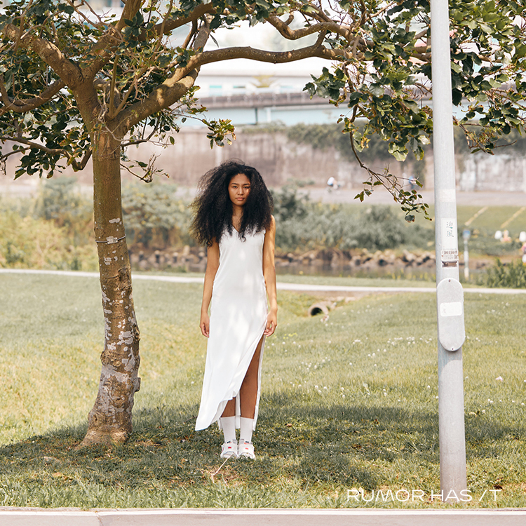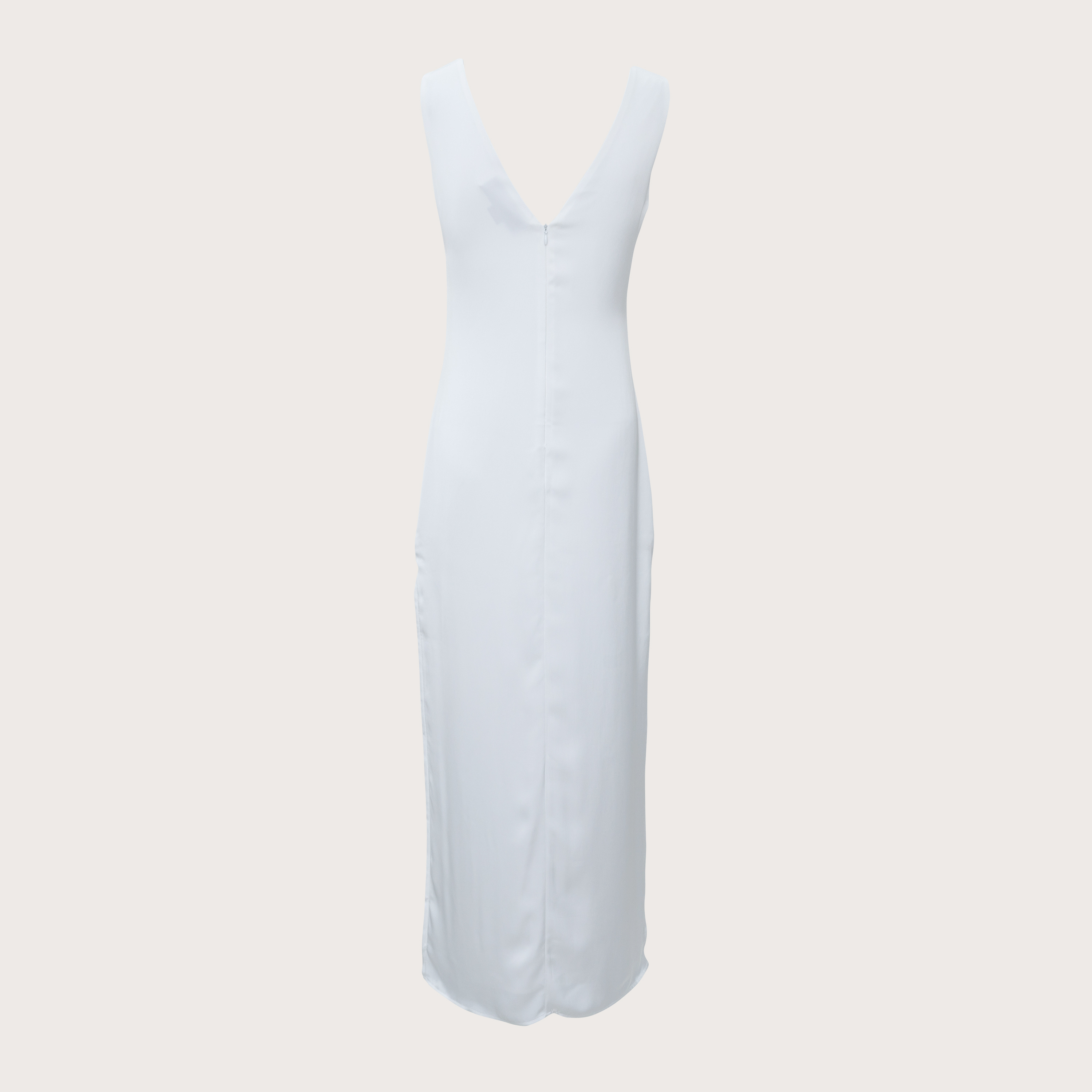 V領型設計,裙擺側邊開雙衩,緞面材質。