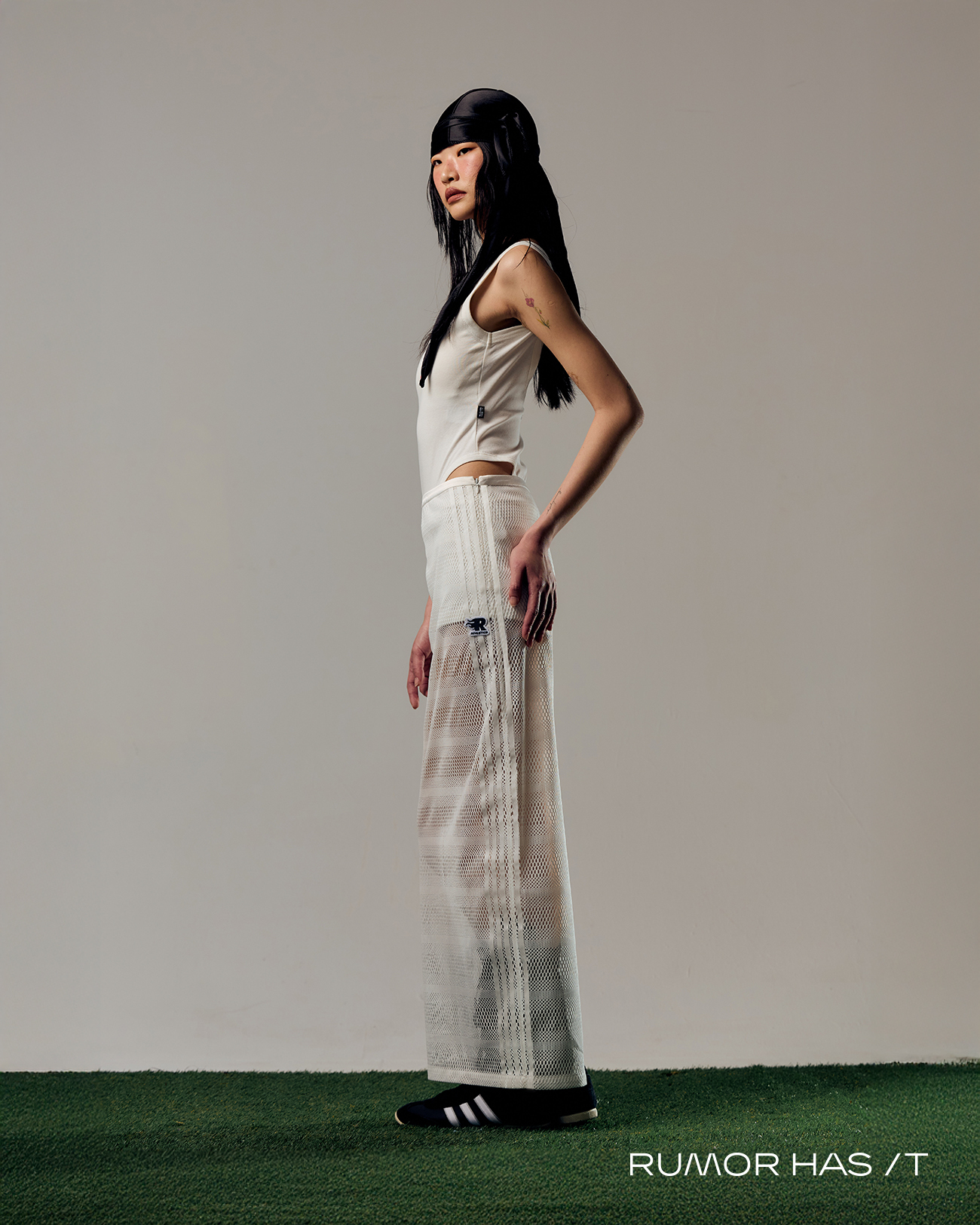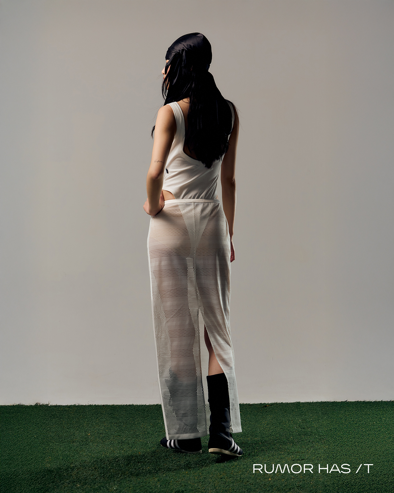 直筒剪裁的長裙配上網狀布料